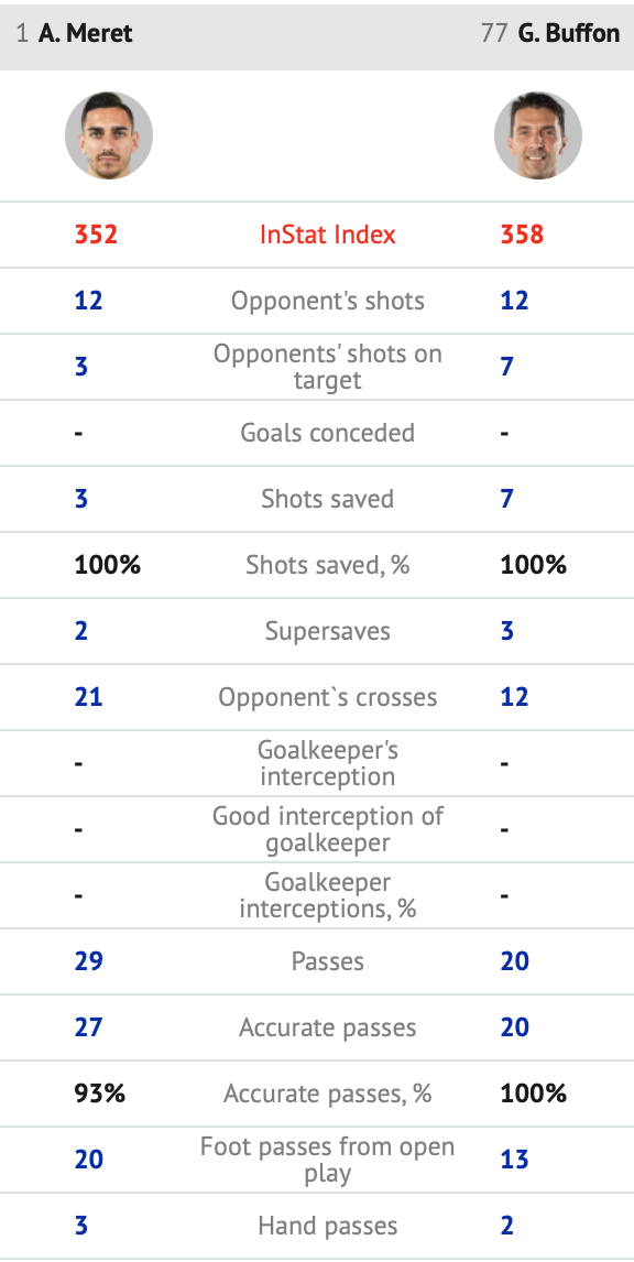No aj napriek tomu dokázal, že je stále Numero Uno a vek je len číslo. Buffon dosiahol InStat index 358. Mňa osobne na Buffonovi fascinuje to, ako si dokázal počas celej svojej bohatej kariéry udržať stabilne vysokú úroveň v zápasoch a prispôsobiť sa vývoju vo futbale. Najmä v hre nohou.
